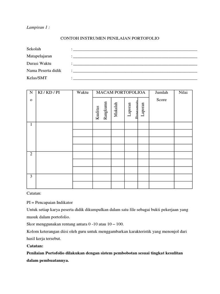 Contoh lembar penilaian portofolio ini diharapkan bisa menambah referensi bagi anda yang sedang mencari informasi atau berkas seputar contoh selengkapnya mengenai susunan dan isi berkas contoh lembar penilaian portofolio ini silahkan lihat pada file preview dan download file lainnya. Setelah melalui diskusi dengan para siswa diperoleh keputusan bahwa siswa harus mengumpulkan portofolio. Maka diperjumpaan kali ini akan kembali kabarkan.com paparkan materi tentang contoh portofolio dengan besertakan pengertian, fungsi, cara membuat, perbedaan, dan. Salah satu keunggulan penilaian portofolio adalah memberikan kesempatan kepada peserta didik untuk lebih banyak terlibat, dan peserta didik sendiri dapat dengan. Pengertian instrumen penilaian secara umum yang dimaksud instrumen adalah suatu alat yang memenuhi persyaratan akademis, sehingga dapat penilaian portofolio (portfolio assesment) merupakan salah satu bentuk performance assesment. Penilaian dalam proses pembelajaran merupakan salah satu hal yang penting, guna mengetahui dan mengukur sejauh mana daya tangkap dan perkembangan pengetahuan yang dimiliki anak. Guru kelas vi akan melakukan penilaian portofolio untuk melengkapi blangko penilaian yang telah disiapkan. Teknik penila ian tertuli s bentuk instrumen menjodohkan contoh instrumen 2 bahasa indonesi a. Instrumen penilaian penilaian antar teman. A) tulislah identitas peserta didik yang diamati. Instrumen penilaian sikap pengetahuan dan ketrampilan. Melaksanakan tindak lanjut dengan memberikan arahan kegiatan berikutnya dan tugas pengayaan. Portofolio bukan hanya merupakan tempat penyimpanan hasil pekerjaan peserta didik tetapi merupakan sumber informasi bagi guru dan peserta.